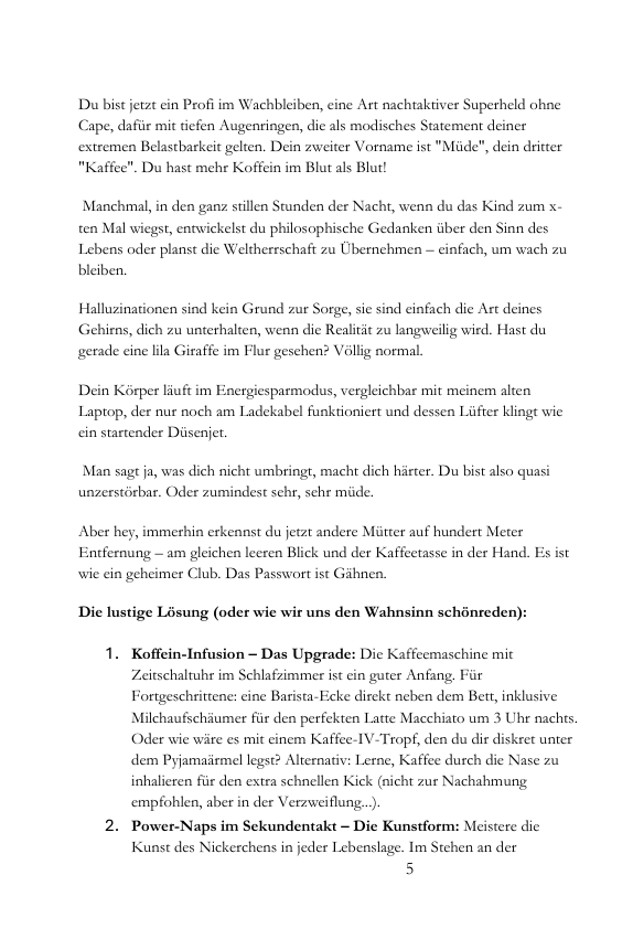 Willkommen in der Liga der Augenringe und Dauer-Müdigkeit! Dieses Buch ist kein pädagogisch wertvoller Ratgeber mit Bastelideen und Breirezepte – es ist dein Rettungsring im Ozean aus Schlafmangel, Haushaltswahnsinn und kindlicher Anarchie.